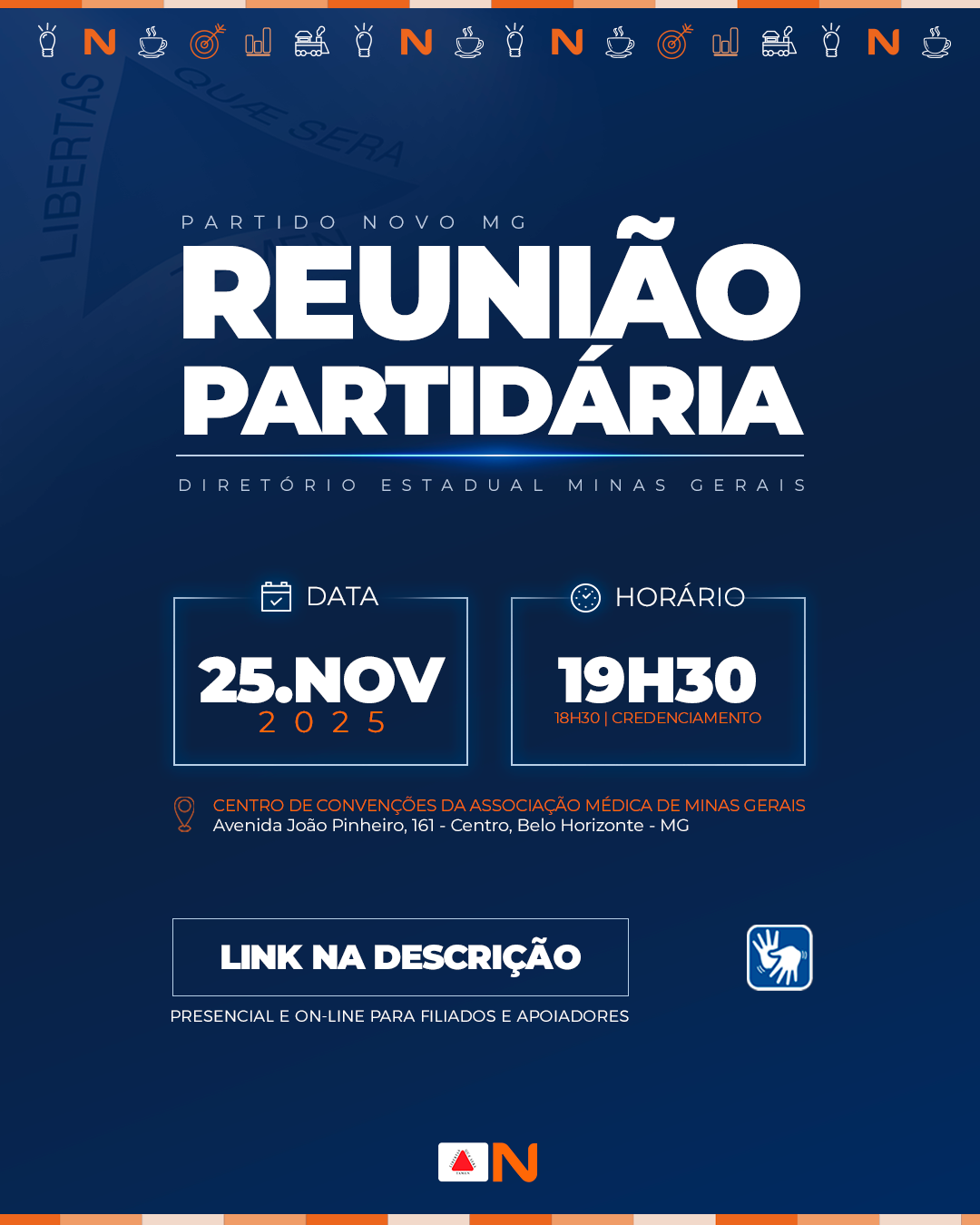 Centro de Convenções da Associação Médica de Minas Gerais Av. João Pinheiro, 161 - Centro, Belo HorizonteReunião Partidária – Novembro 25 de novembro, 2025 | 18:30 - 21:30 Este ano, o Partido Novo comemora 10 anos, e para seguirmos com às comemorações, teremos nossa última reunião partidária do ano. Você não pode ficar de fora!Junte-se a nós e leve um convidado! O evento é aberto a filiados e apoiadores.Ingressos PRESENCIAIS: Vagas limitadas.Ingressos VIRTUAIS: O link de acesso será enviado para o e-mail registrado no cadastro de filiação na data do evento.Além de participar da reunião, você também poderá adquirir produtos exclusivos do NOVO, que estarão disponíveis para retirada no local.Data: 25/11/2025Horário: 18h30 (Credenciamento) | 19h30 - 21h00 (Reunião)Local: Centro de Convenções da Associação Médica de Minas Gerais, Av. João Pinheiro, 161 - Centro, Belo Horizonte - MG, 30130-183. Estacionamento: R$ 30,00 (Rua Guajajaras, 203 – Centro)Nos vemos lá! Faça sua inscrição Não perca este evento! Garanta sua participação e aproveite essa oportunidade única para aprender, trocar experiências e se conectar. Inscreva-se e viva essa experiência com a gente! ME INSCREVER confira o local do nosso evento Centro de Convenções da Associação Médica de Minas Gerais Av. João Pinheiro, 161 - Centro Belo Horizonte, Minas Gerais 30130-183 Brazil Confira mais dos nossos eventos Detalhes do evento
