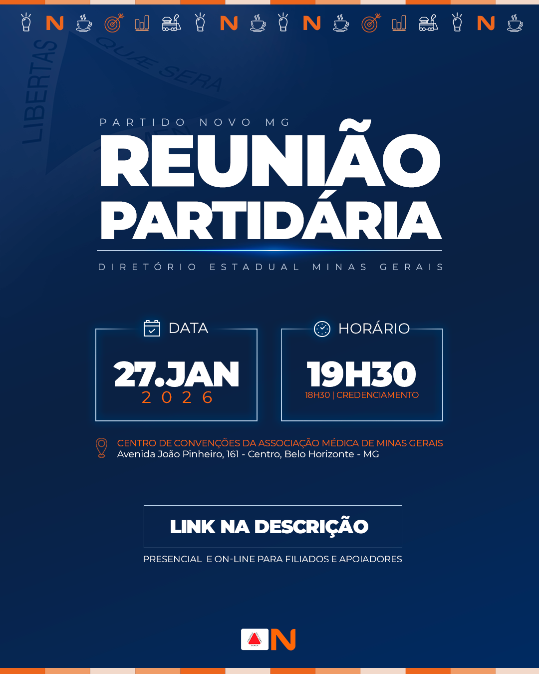 Reunião Partidária | Janeiro 2026 27 de janeiro, 2026 | 19:00 - 21:30 No próximo dia 27 de janeiro de 2026 teremos nossa primeira reunião partidária do ano. Será um momento decisivo para nos alinharmos e traçarmos os planos e estratégias para um ano especial: ano de campanha, de mobilização intensa e de construção de vitórias! 2026 será um ano de grandes desafios e ainda maiores oportunidades para fortalecer nossos ideais, ampliar nossa presença, preparar nossas candidaturas e impactar ainda mais pessoas com nossos princípios. Junte-se a nós e leve um convidado! O evento é aberto a filiados e apoiadores. Ingressos PRESENCIAIS: vagas limitadas. Ingressos VIRTUAIS: o link de acesso será enviado para o e-mail registrado no cadastro de filiação na data do evento. Além de participar da reunião, você também poderá adquirir produtos exclusivos do NOVO, que estarão disponíveis para retirada no local, conforme disponibilidade de estoque. Data: 27/01/2026 Horário: 19h00 (Credenciamento) | 19h30 – 21h00 (Reunião) Local: Centro de Convenções da Associação Médica de Minas Gerais Av. João Pinheiro, 161 – 2º andar, Centro, Belo Horizonte – MG, 30130-183 Estacionamento: R$ 30,00 (Rua Guajajaras, 203 – Centro) Nos vemos lá! Vamos juntos construir 2026! Faça sua inscrição Não perca este evento! Garanta sua participação e aproveite essa oportunidade única para aprender, trocar experiências e se conectar. Inscreva-se e viva essa experiência com a gente! ME INSCREVER confira o local do nosso evento Centro de Convenções da Associação Médica de Minas Gerais Av. João Pinheiro, 161 - CentroBelo Horizonte, Minas Gerais 30130-183 Brazil Confira mais dos nossos eventos Detalhes do evento |